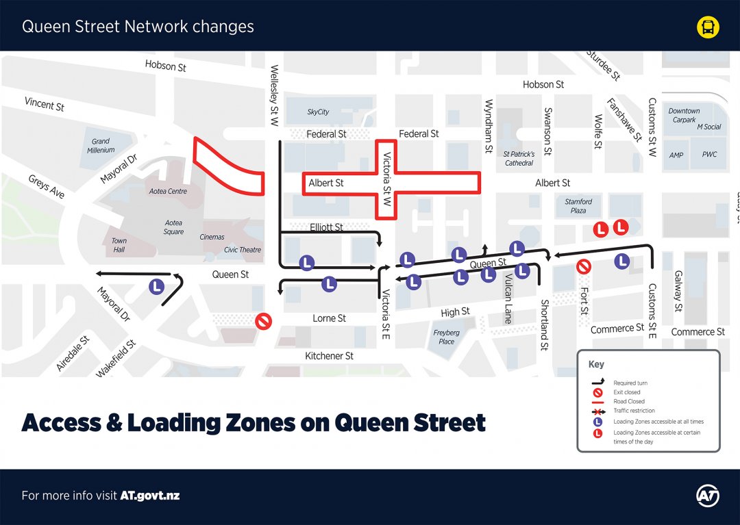There will be no restrictions to access from Customs Street heading south, and this means that the current loading zones and parking will be available 24/7.